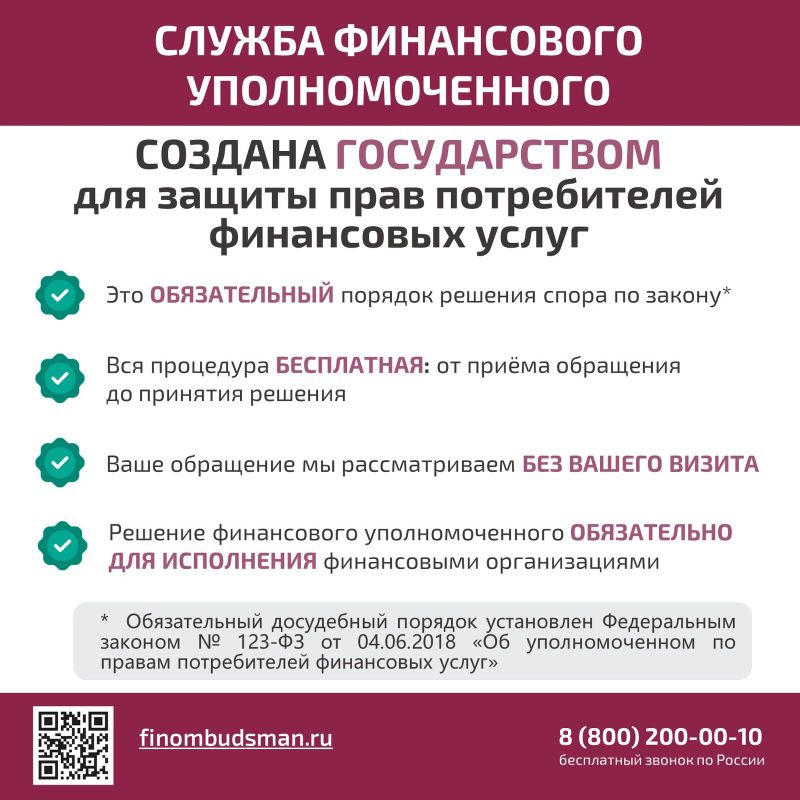 Напомним, что Служба финансового уполномоченного взаимодействует с потребителями финансовых услуг лишь в том случае, если потребитель подал обращение к финансовому уполномоченному или обращался с вопросом в контактный центр Службы.Вместе с тем рассмотрение финансовым уполномоченнымобращений потребителей бесплатно по закону.Официальный сайт Службы финансового уполномоченного finombudsman.ru