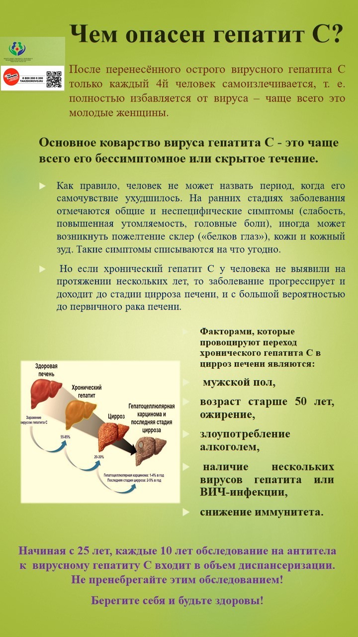 Начиная с 25 лет, каждые 10 лет обследование на антитела к вирусному гепатиту С входит в объем диспансеризации. Не пренебрегайте этим обследованием!