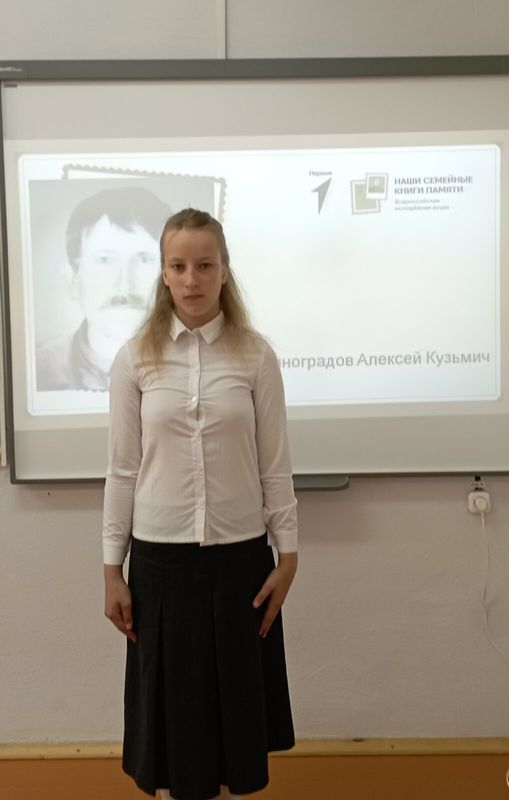Зрителей впечатлил рассказ ученицы 5 класса Виноградовой Алены о прапрадеде Виноградове Алексее Кузмиче, участнике ВОВ, погибшим в 1943 г. Алена прочла фронтовые письма, которые получал младший сын Алексея Кузьмича и бережно хранил их для своих потомков.